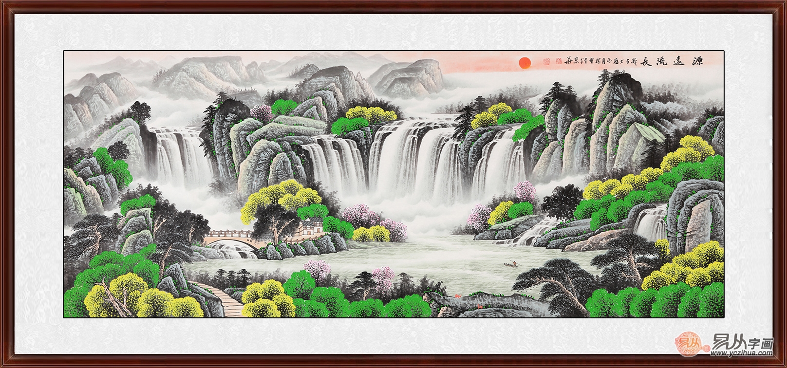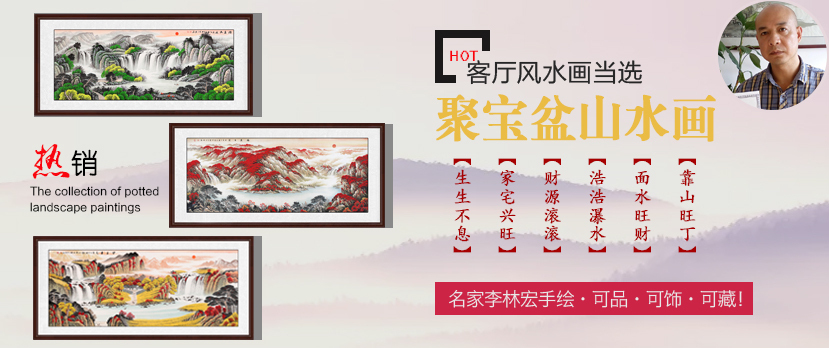 画面中山峦挺拔,在风水中山脉有着龙脉之说,山脉犹如人脉,山脉连绵长远,象征人脉多,交游广阔,根基雄厚。画面重峦叠嶂,层次丰富,有分支、有起伏者风水极佳,山间点缀的松树姿态万千,伞状的造型是一种挡灾避难的风水寓意,松树在门前又有迎客招财之意,山峦之间有房屋在平台之上,有家宅人丁兴旺之意,也有事业开阔,朱雀振翅发展之意。挂于家中客厅基业永固,守固财运,非常不错的挂画选择。 生意人客厅挂画推荐五: ![]() 客厅旺财风水画 李林宏聚宝盆山水画《源远流长》作品来源:【易从网】 山主丁水主财,经典的聚宝盆山水画风水构图,是居家客厅旺财挂画的首选!做生意的人家中又怎能少的了这样的风水挂画?画中飞瀑长流,汇聚中心潭中,此为聚宝盆的格局展现。