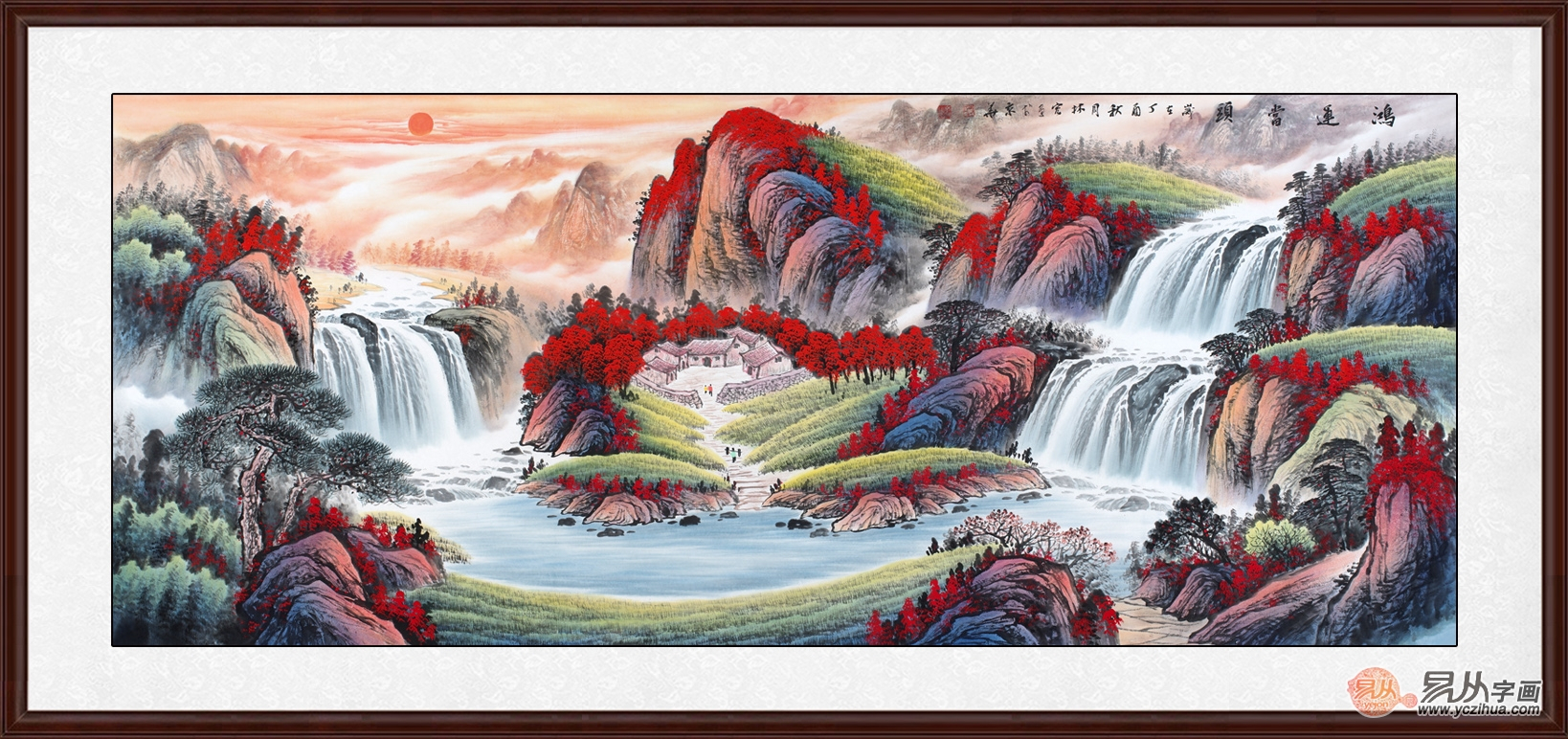 主题群山绵延无尽,大面积朱砂点染,象征家人的鸿运当头,朱砂着火,满山红叶与秋之金火辉映山间,元宝山骤然呈现;碧树描金,华彩辉煌,枝繁叶茂,坐地生财、财源广进寓意其火;宝山碧树环拥三泉河流,俨然一个金光碧火的聚宝盆。 生意人客厅挂画推荐三: ![]() 鸿运天成 李林宏八尺红色聚宝盆风水画《鸿运当头》作品来源:【易从网】 玄武垂头,朱雀翔舞,青龙蜿蜒,白虎驯俯,“山管人丁,水管财禄”,有山有水的山水画,不仅有着大自然山川的秀美之姿,而且还能体味中国画的意境、格调、气韵和色调。