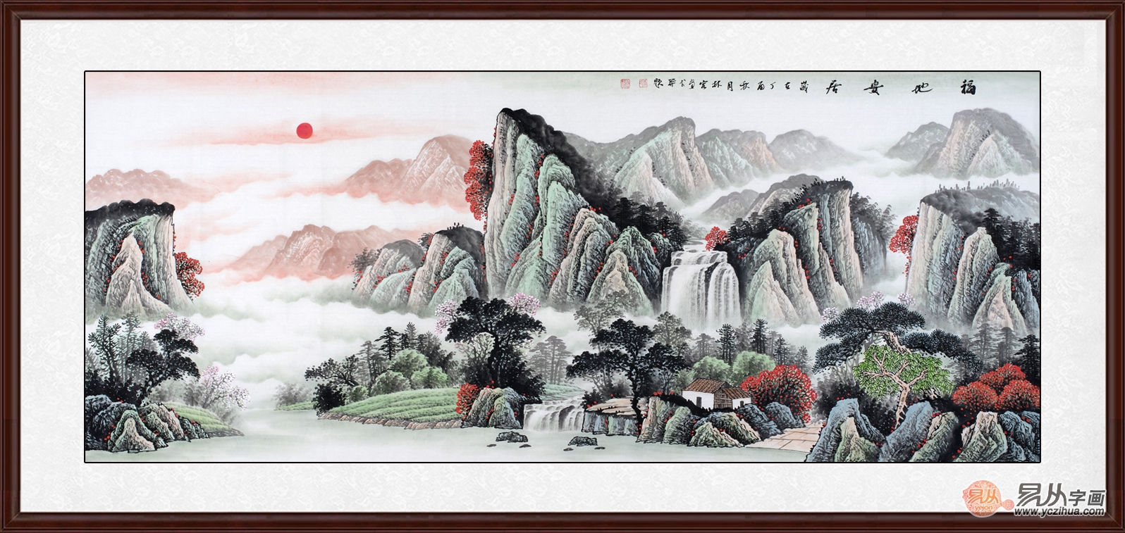 从风水学中分析,山水画水源流畅预示着财源滚滚,祥云环绕预示着吉祥如意,人居高地,背有青山,前有绿水,此幅山水画巧妙地将聚宝盆和鸿运当头好风水巧妙融合在一起,将四大神兽“青龙、白虎、朱雀、玄武”完美融入山水画中,有北玄武,福寿绵延 、南朱雀,振翅开阔、左青龙,贵人相助、右白虎,辟邪镇宅之意。 生意人客厅挂画推荐四: ![]() 家中经典挂画必选 李林宏山水画作品《福地安居》作品来源:【易从网】 浩荡烟云存于山间,初升的太阳极具朝气,浩浩正气洒人间,映山红给人鸿运当头之感,古松苍天笔挺,有君子之威风,是祈福之寓意。山势险峻,草木泽生,云烟浮动,云霞卷舒,洋溢着盎然生机。