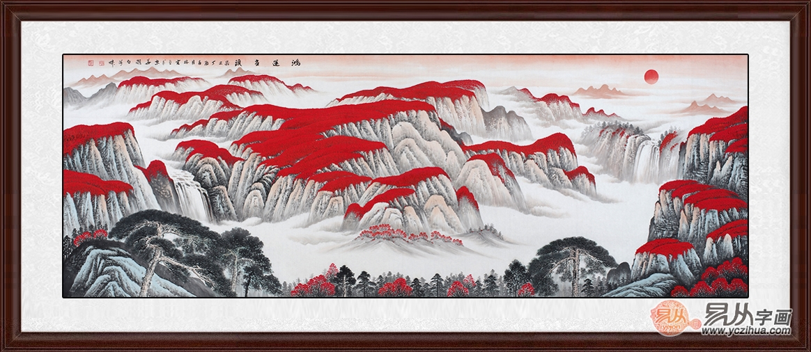 林宏笔下青绿长城有青龙之象征,青龙为东方之神,是中国古代的神兽之首,麒麟首、鲤鱼尾、代表春季,青龙属木,因此在风水学中,具有驱邪惩凶,除恶扬善,逢凶化吉,亦能起到镇宅纳福,带来安宁和平的作用。 青龙同样属于瑞兽之一,有祥瑞之兆,代表招贵人,除小人是非。有靠山,有龙脉绵延千里,福禄吉地,人丁兴旺,财喜双至。 生意人客厅挂画推荐二: ![]() 气派客厅挂画 李林宏吉利红山水画作品《鸿运当头》作品来源:【易从网】 这是一幅万山红遍的鸿运当头风水画,红文化在中国有着特殊的象征,我们的国旗就是红色的,所以在中国的古老文化中红色是一种胜利,吉利的颜色。