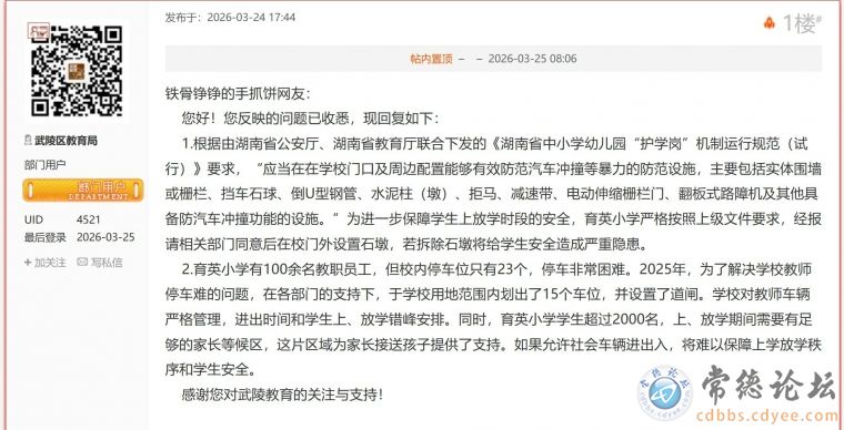 1、针对武陵区教育局回复中:“在各部门的支持下,于学校用地范围内划出了15个车位,并设置了道闸。”
